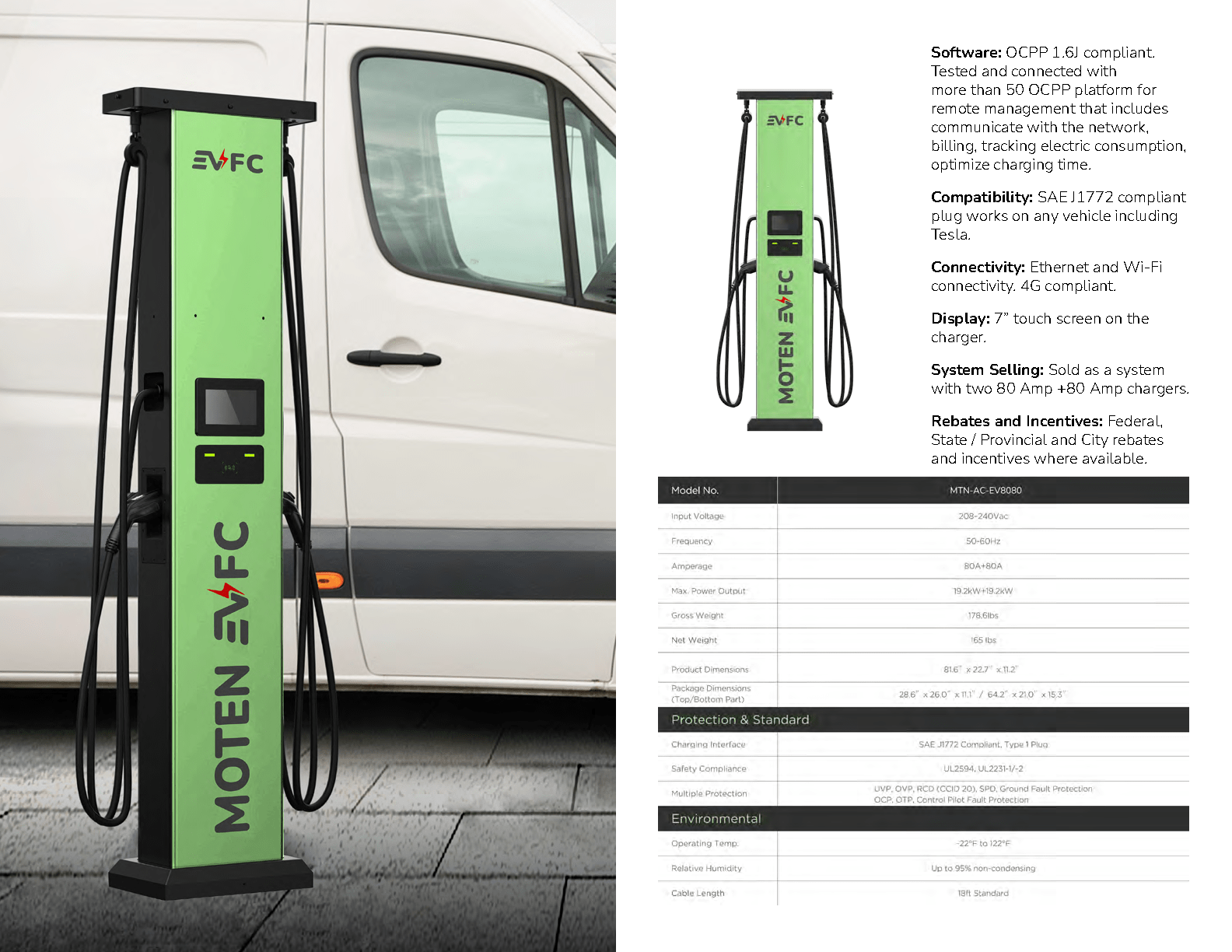 Power: Single Phase Level 2 AC240V 19.2KW 80 amp, UVP, OVP, RCD (CCID 20), SPD, Ground Fault Protection, OCP, OTP, Control Pilot Fault Protection.